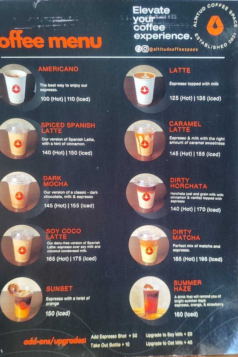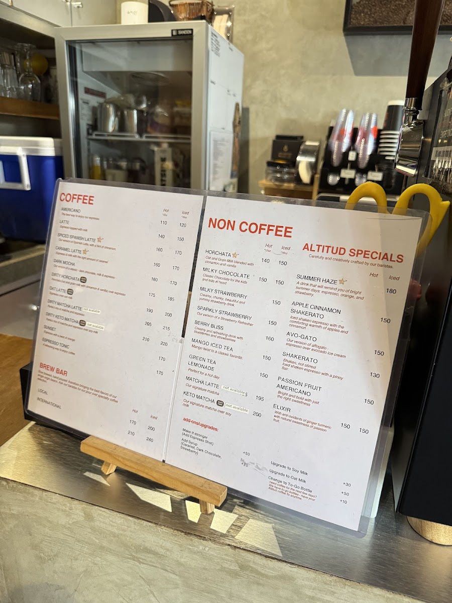 Welcome to Altitud Coffee Space, a charming café nestled in the Pilar Development Center in Las Piñas, Metro Manila. Known for its rich and expertly crafted coffee, this spot has quickly become a favorite among locals. The menu features a variety of drinks, including the highly praised summer haze and delightful Spanish lattes, ensuring there's something for everyone.